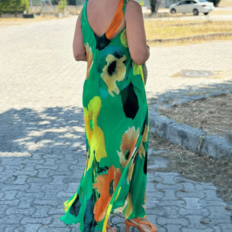With its painterly blossoms and full-length flow, this dress combines joyful colour with graceful movement, perfect for holidays, garden parties, or effortless daywear.